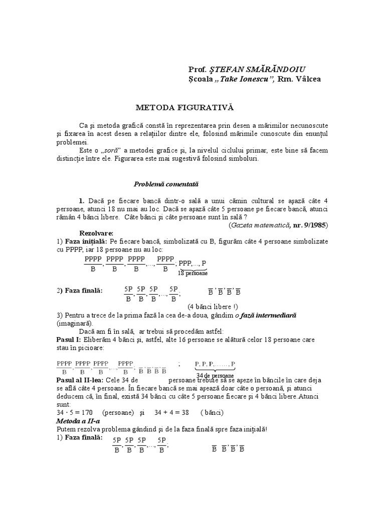 vizitati articolul complet aici : https://ro.scribd.com/doc/191790444/METODOLOGIA-ACTIVIT%C4%82%C5%A2II-DE-REZOLVARE-A-PROBLEMELOR-PRIN-METODA-FIGURATIV%C4%82 Matematica, metoda figurativa, metoda grafica, probleme, probleme cu bani, probleme matematice, probleme matematice dificile. Ea contine teoria numerelor intregi , a numerelor rationale de multe ori elevii vad in fiecare problema propusa o problema noua care nu ar avea nici o legatura cu cele rezolvate anterior. Diavinad8 и 16 других пользователей посчитали ответ полезным!